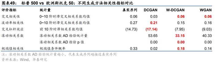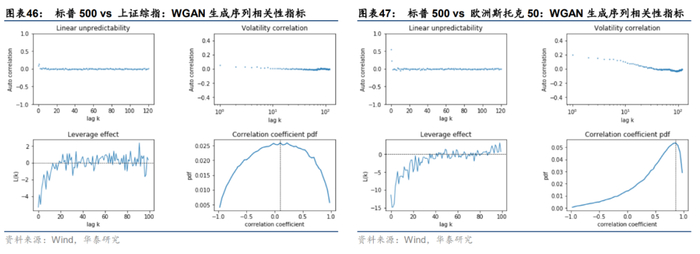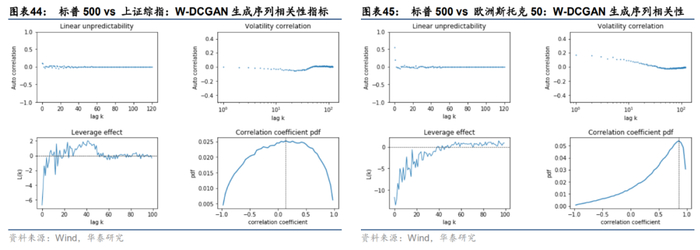 2. 波动率相关性:真实的多资产收益率序列呈现正的低阶波动率相关性;W-DCGAN能够复现标普500与欧洲斯托克50的低阶波动率相关性,但未能复现出标普500与上证综指的低阶波动率相关性,相比之下DCGAN和WGAN表现更好。