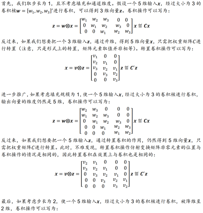 在DCGAN网络结构中,生成器使用转置卷积完成低维特征向高维特征的映射即上采样,判别器使用卷积完成高维特征向低维特征的映射即下采样,因此充分理解卷积和转置卷积的操作机制是重要且必要的。尽管从字面意思上来看,转置卷积操作与卷积操作相反,但事实上并非严格相反,且转置卷积的过程理解起来更晦涩。对此,本文引入仿射变换的形式,以一维卷积和转置卷积操作为例,对比两者的机制异同。