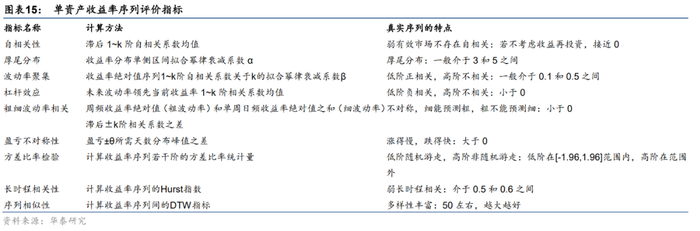 Cont在2001年发表的综述文章Empirical properties of asset returns: stylized facts and statistical issues从厚尾分布、盈亏不对称性、波动率聚集等11个角度,Chakraborti等人在2011年发表综述文章Econophysics review: I. Empirical facts从价格、收益率、成交量、波动率等角度,分别构建了单资产序列的评价指标。