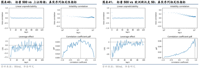 1. 交叉相关性:两图中的左上子图展示两收益率序列的k=0~120阶时滞交叉相关系数。观察可知,标普500和欧洲斯托克50存在显著的0阶和1阶正相关性,标普500和上证综指存在一定0阶和1阶正相关性,体现出全球股票资产的联动性。此外,两对资产之间均不存在显著的更高阶交叉相关性。