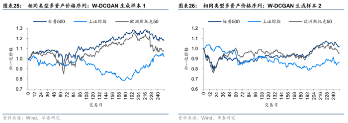 下面两张图展示DCGAN随机生成的两组样本,生成的多资产收益率序列已转化为归一化价格序列。直观上看,标普500和欧洲斯托克50存在强的正相关性,两者和上证综指存在相对弱的正相关性,该现象与真实序列一致。