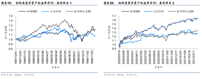 仅从上节展示的价格序列看,很难直观判断生成序列的质量,需结合量化指标对生成序列进行更为细致的评价。下面我们分别从单资产序列和多资产序列两个角度评价和对比生成序列的质量。