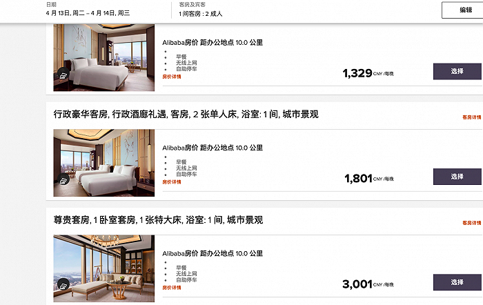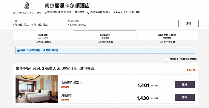 以南京丽思卡尔顿酒店为例,在4.12-4.13这一日期内,普通旅客入住该酒店豪华客房的价格是1430元,而使用阿里巴巴协议价入住相同房型的价格是1287元。这其中一晚就产生了近150元的差价。