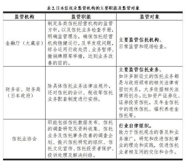 日本信托业务的监管机构有金融厅、财务省、财务局以及信托业协会。金融厅主要负责对信托机构等各类金融机构进行监管;财务省、财务局主要负责对具体的信托业务进行监管;信托业协会为自律组织,主要负责信托业研究和信托文化普及,加强信托机构自律,并对信托业的监督管理发挥积极作用。在信托业法及其配套法律框架下,监管机构职能和分工明确,统一施行法律法规和相关具体规则,使得信托业法及相关法规更具可执行性。