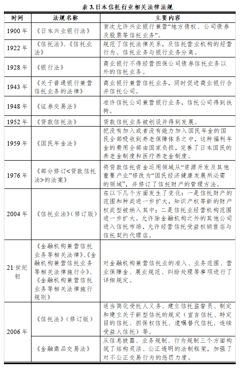 从最初的《信托法》、《信托业法》、《关于普通银行兼营信托业务的法律》等基本的法律对信托业加以规范和约束,《贷款信托法》、《证券投资信托法》、《不动产登记法》、《所得税法》、《抵押公司债券信托法》、《国民年金法》、《法人税法》等随后陆续颁布,这些法律共同构成了日本的信托监管法律体系。