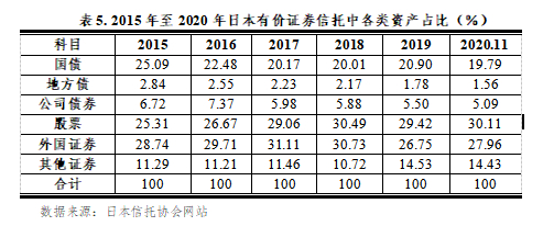一方面,由于利率持续低下,加之银行与保险公司的信用风险日益增大,促使大众投资者开始转向投资信托。同时,竞争激烈导致基金管理水平的提高,以及证券行业的规范化管理也在一定程度上提高了大众投资者对投资信托的期望值。日本的投资类信托以证券投资信托为主,日本信托银行对证券资产配置的比例较高,在对有价证券的配置比例方面,对各类标准化的资产进行较为均衡的配置。其中国债的配置比例较高,近10年来一直维持在20%以上,股票和公司债其次,在总资产配置中共占比约30%,剩余的有价证券集中配置地方债、外国证券等,以分散投资方面的风险,在保证投资收益的同时确保业务的稳健,保护投资者的利益。