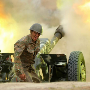 2020年9月28日,纳戈尔诺-卡拉巴赫,亚美尼亚与阿塞拜疆的武装冲突持续。一名亚美尼亚军人向阿塞拜疆阵地发射了一枚炮弹。