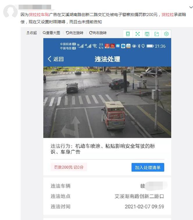 上述司机在社交平台上发布的内容,透露了以下几点内容:一是确有不少司机因为货拉拉车贴被交警罚款扣分;二是货拉拉要求司机必须张贴相关车贴,并会不时抽查,司机违反就会被罚款;三是一旦被交警罚款,货拉拉承诺赔偿,但时限需在一个月内。