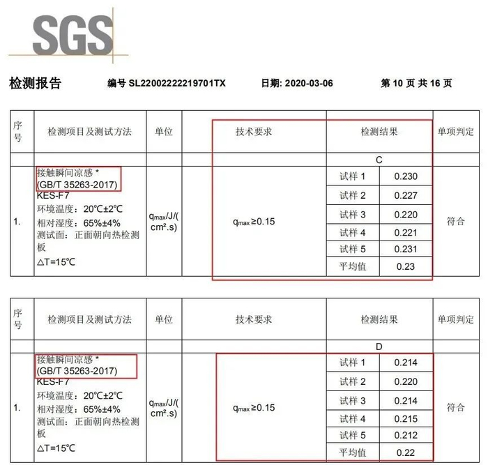 可以看到检测报告上,按照技术要求,瞬间凉感值超过只要超过0.15就算达标,我们这款被子的凉感值高达0.22~0.23,大大高出达标值。