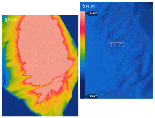 (红外热感仪:越红=越热,越蓝=越凉)