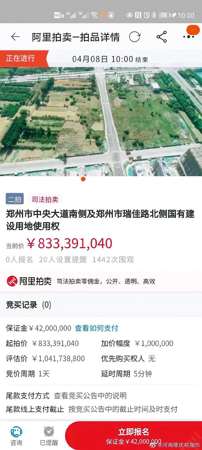 根据河南高院2021年4月9日发布的通报:2018年7月4日,隆庆祥股东袁小杰、王艳艳主动要求郑州中院拍卖隆庆祥公司名下的牟国用(2013)089号和090号两宗土地使用权。《中国新闻周刊》获得的案卷资料显示,当时,郑州中院委托评估公司对上述两宗土地进行评估。评估公司提交了两份《土地估价报告》,其中089号土地估价20975.54万元,折合每亩450.17万元;090号土地估价51884.53万元,折合每亩496.59万元。2018年8月6日,隆庆祥代理人武中文向郑州中院出具《情况说明》,对地价评估报告无异议,并请法院“尽快组织公示及拍卖,两块土地一并拍卖。”郑州中院(2018)豫01执异400号执行裁定书显示,当天,法院作出土地拍卖裁定。