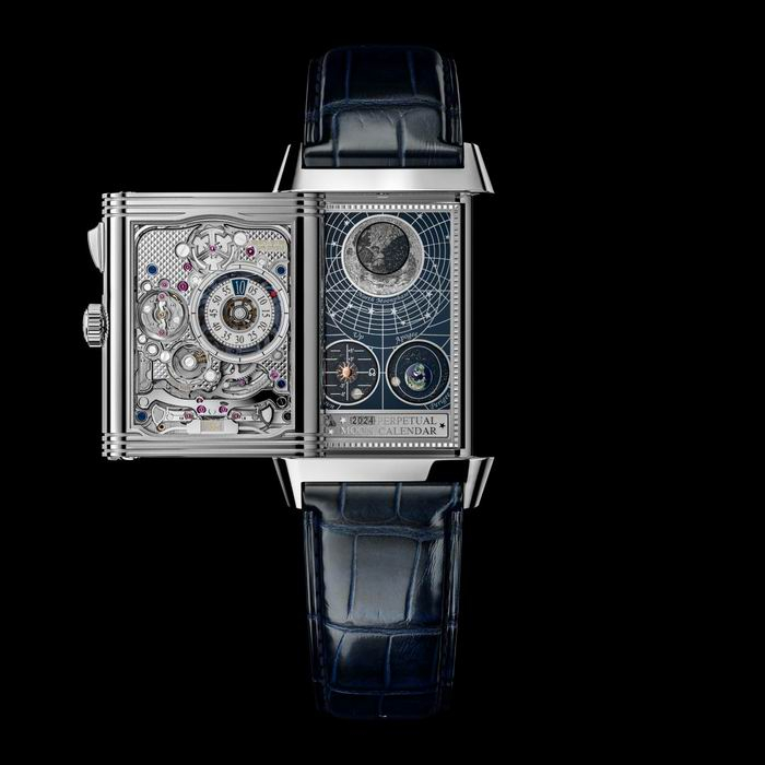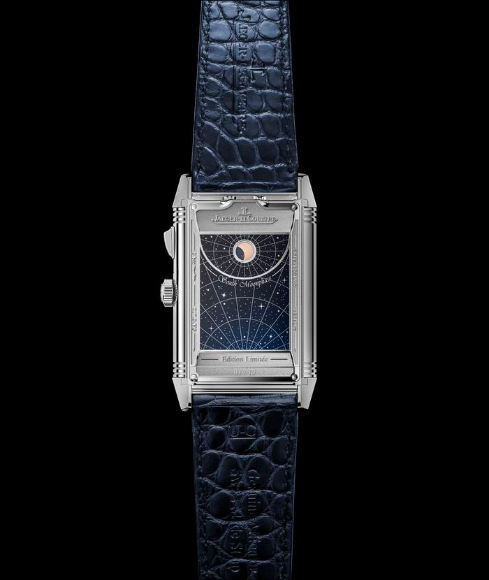 腕表的第一表盘融合了陀飞轮与万年历。翻转过来,背面的第二表盘呈现报时运行,第二表盘显示时间与正面表盘所指示时间相同,但采用瞬跳数字小时和外缘指示分钟显示。平时与第二表盘相对的第三表盘上,积家将三项月相信息(会合周期、交点周期和近点周期)汇集于同一款腕表上,这在机械制表历史上尚属首次,通过显示可判断日食和月食发生的时间,以及超级月亮等罕见天象。而在第三表盘的背面,第四表盘上显示南半球月相。