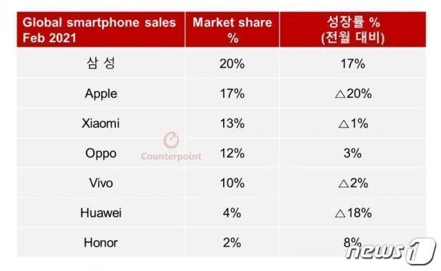 根据全球知名数据调研机构Counterpoint近日公布的2021年2月份全球智能手机调查报告数据,荣耀在全球的市场份额只有2%,排名第7。
