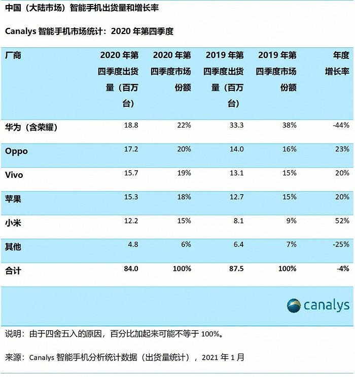 荣耀战斗力可能是其中最小的。今年1月,Canalys在发布中国2020年第四季度智能手机出货量后,如此评论:“OPPO、vivo和小米竞相争夺华为遍布全国的线下渠道资源,其中不乏包括乡镇的渠道伙伴,并在门店扩张和营销支持方面投入巨额资金。这些举措带来了立竿见影的效果,市场份额在短短几个月内迅速上升。积极扩张是OPPO、vivo和小米在2021年渠道建设的关键词。”