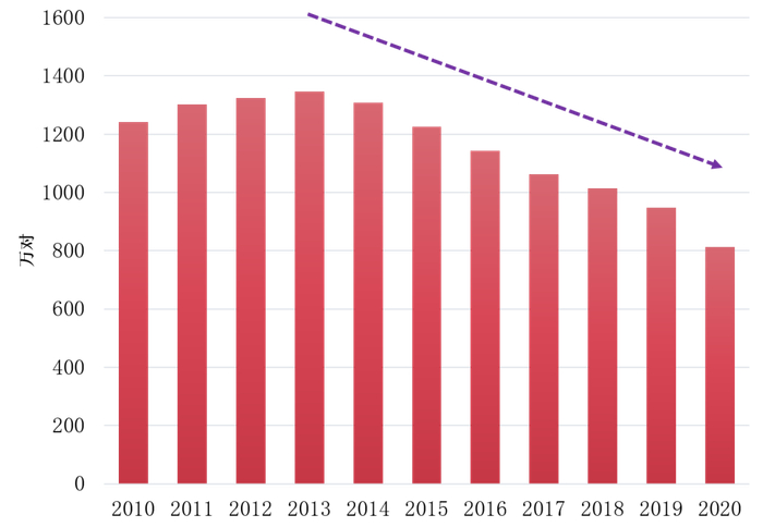 根据3月出炉的民政统计数据,2020年,全国结婚登记人数813.1万对,自2014年起,连续第七年下降。