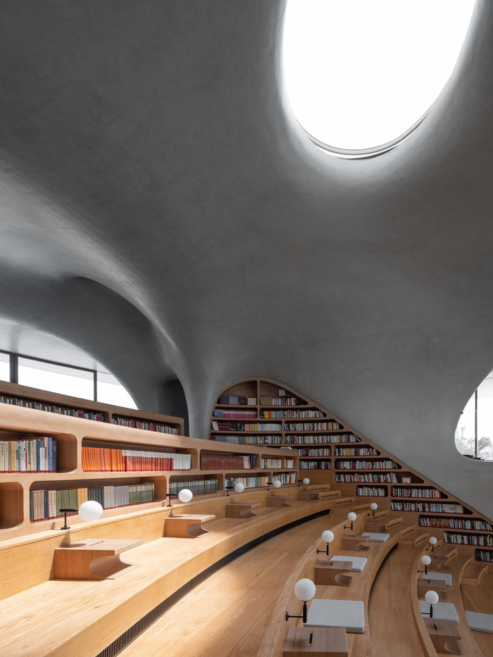 与主阅读空间隔离的儿童阅读区,天窗、孔洞、壁龛,激发孩子们探索的欲望。可开启的玻璃天窗和超大弧型推拉门带来更好的采光、观海视野和通风效果。结构形态形成的多个半室外空间和平台,是人们阅读和望海的绝佳空间。