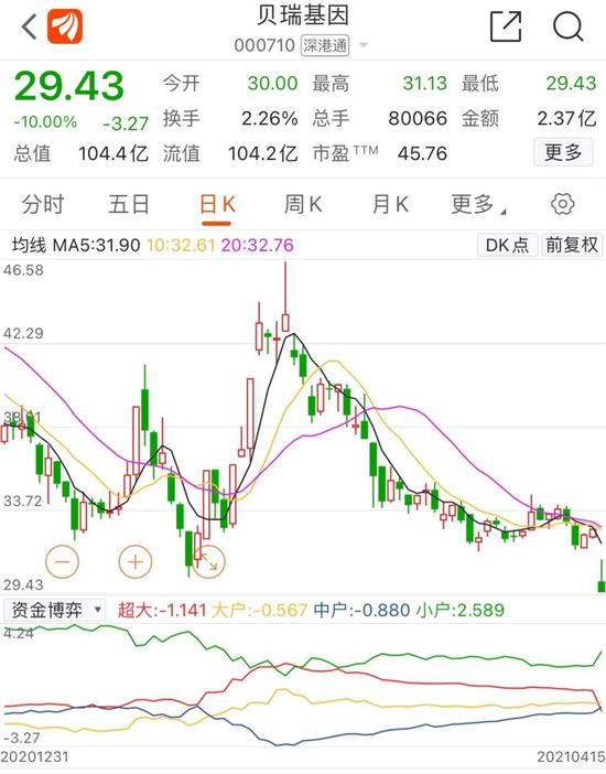 不过,二胎概念股中,也有特立独行的,受业绩下降影响,贝瑞基因今日大幅低开,半个多小时后,该股就被封住跌停板。4月14日晚间,贝瑞基因发布业绩快报,2020年实现营收15.4亿元,同比下降4.78%,净利润为2.11亿元,同比减少46.07%。此外,贝瑞基因还发布了业绩预告,预计2021年一季度净利润为2000万元-3000万元,同比下降52%-68%。