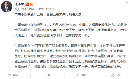 看到央行刊发的上述工作论文后,回归券商没多久的东吴证券首席经济学家任泽平也出来发声了。4月15日上午,任泽平在微博发文称,未来不仅会放开三胎,四胎五胎未来可能给奖励。
