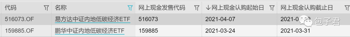 现在一个概念火起来,基金公司就可能发行相关的ETF。低碳概念这么火,于是就也有基金公司开始发低碳ETF。易方达低碳ETF(代码:516070)和鹏华低碳ETF(代码:159885)等产品也就应运而生了。