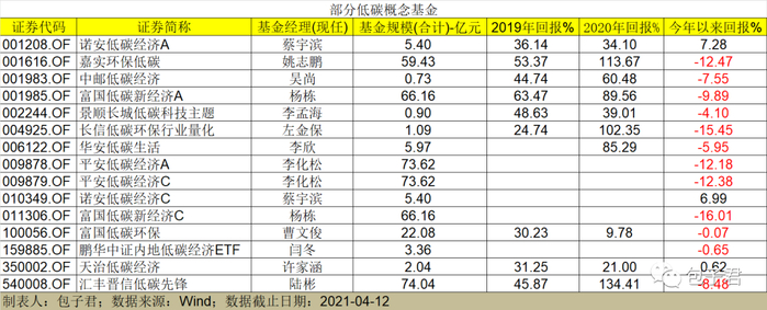 当然,在这些低碳概念基金中2019年和2020年表现较为优异的基金中多为重仓了新能源板块的基金,包括嘉实环保低碳、长信低碳环保行业量化、汇丰晋信低碳先锋等。业绩好的原因相当程度上是因为新能源板块过去两年在风口。