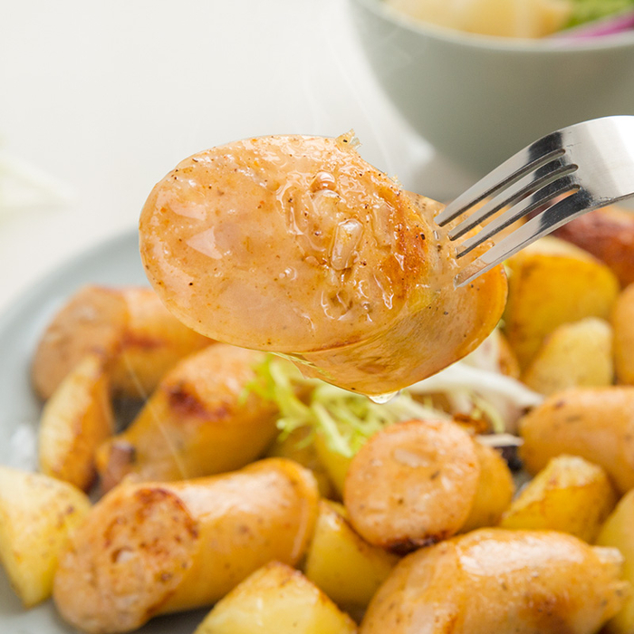 自然放养长大的鸡,肉质紧实,新鲜又健康,热量和脂肪含量也没有纯猪肉肠高。