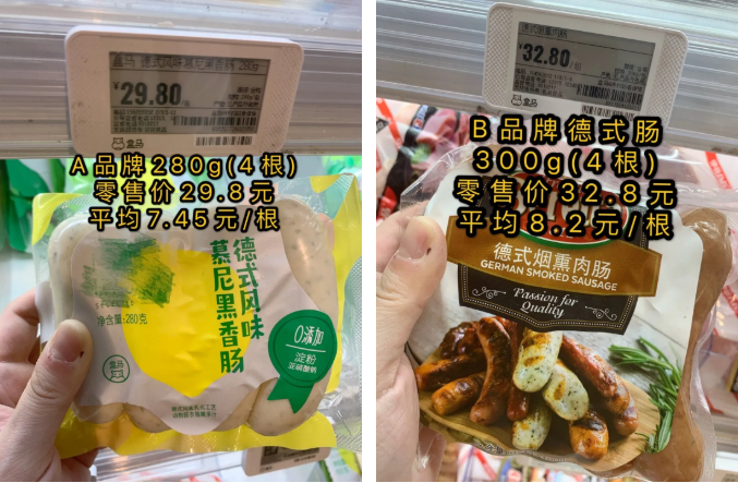 最后我们来看看价格,像这样的德式肠,盒马一般都是29.8元/4根,平均下来一根要7.45元。全家的德式肠也要平均8.2元/根。
