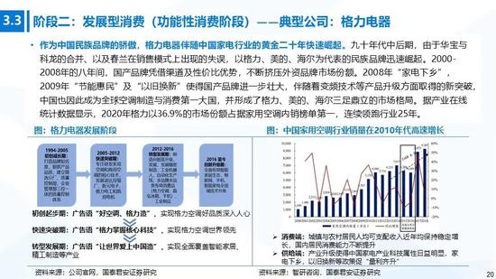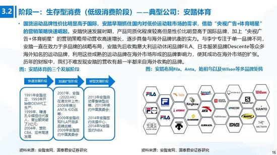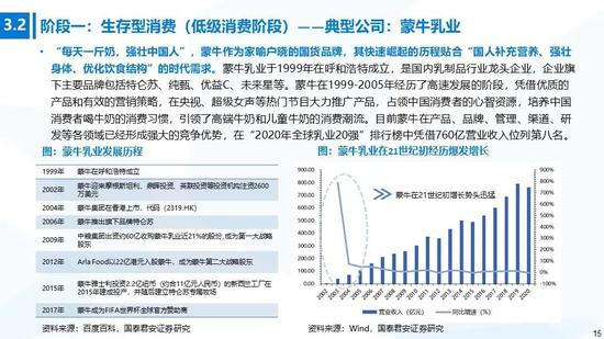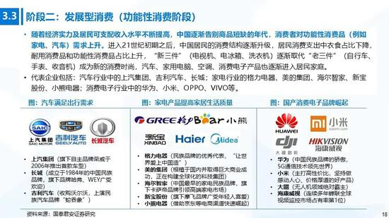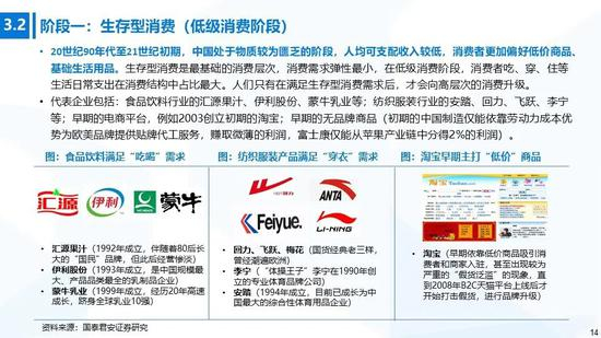 ①生存型消费:在物质较为匮乏的阶段,消费者更加偏好低价商品,吃、穿、住等生活基本支出在消费结构中占比最大。生存型消费是最基础的消费层次,我们可以看到一批国货品牌在消费初级阶段快速成长,主要涉及食品饮料(汇源、伊利)、纺织服装(回力、飞跃、安踏、李宁)、初期电商品牌及无品牌产品等。