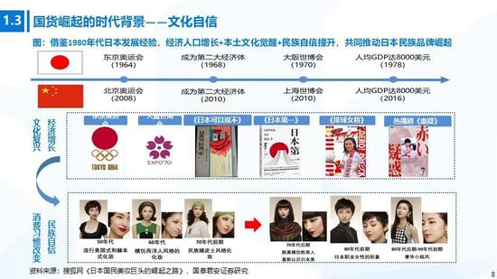②文化自信:中国先后举办世博会、进博会等一系列重大国际交流活动,民族自信心不断提升,借鉴1980年代日本民族品牌崛起的经验,综合国力的增强有助于推动本土文化的觉醒和国货消费量的提升;