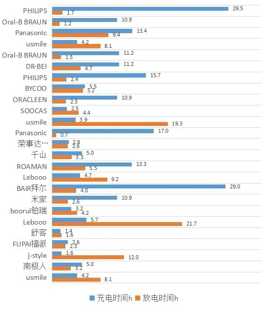 在23款标注了充电时间的电动牙刷中,飞利浦PHILIPS、BAiR拜尔2款样品的实际充电时间超过了标称的最大时间。25款电动牙刷中,实际充电时间最短为1.4小时,最长为29.5小时。