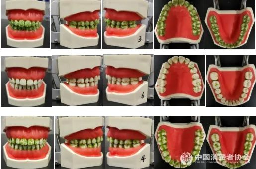 第一行图片为牙模涂抹污物后的原始效果;第二行是经过电动牙刷样品清洁后,效果好的牙模图片;第三行为清洁效果不好的牙模图片。清洁效果一目了然,差别非常明显。
