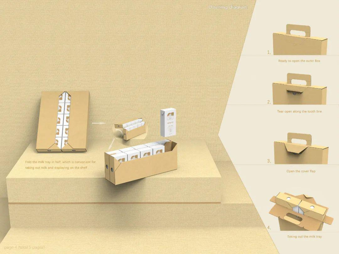 方便用户拿取,创意巧妙的内托设计,取出后对折90度牛奶即可呈现,放至桌面,非常方便拿取。可用作产品展示,开启外盒后,取出装满牛奶的内托对折90度,牛奶成列展现,摆放至货架进行展示宣传。