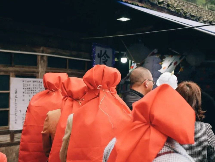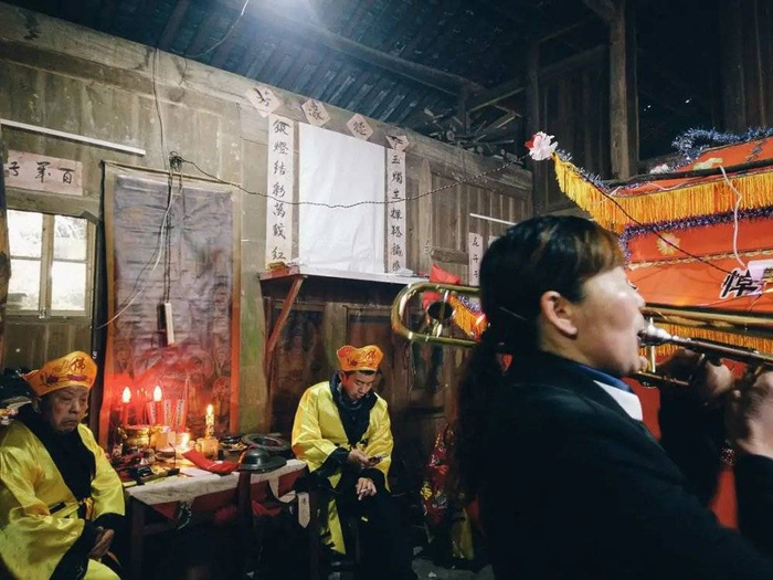 村里送葬上山的时刻多为日出前,一般会找道士先生算好时间,有时候凌晨三点多就要出殡。而乐手们必须在这个点之前赶到。她们跟随送葬人群一路上山,有时候要走很远的山路,几公里,十几公里。而结束后,每人会得到主人家发的20元以及一包烟。