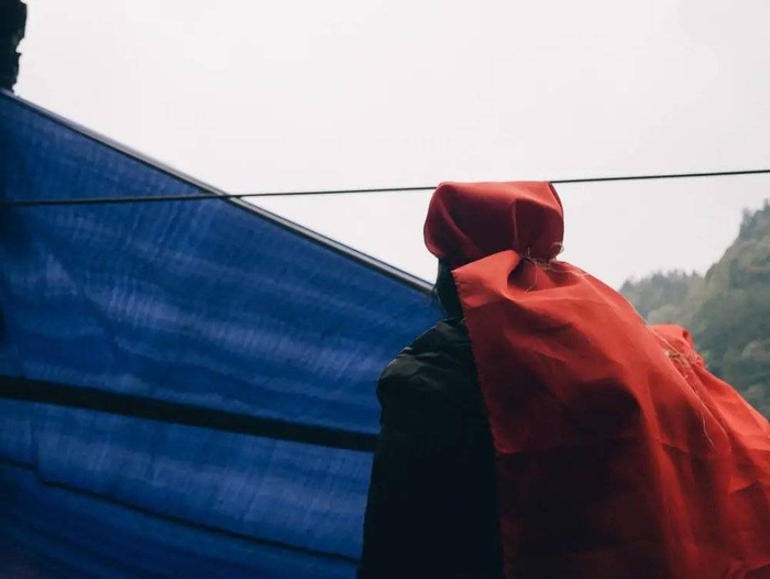 抬着棺材上山。村里人都要来帮忙。棺木上盖着一块红布。