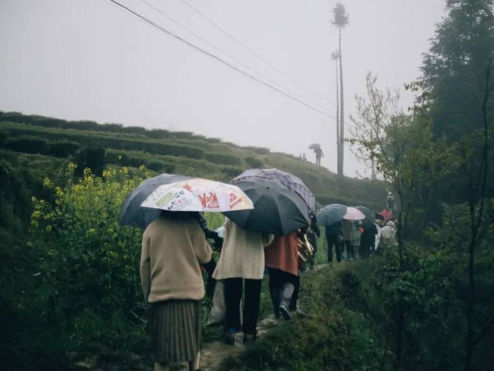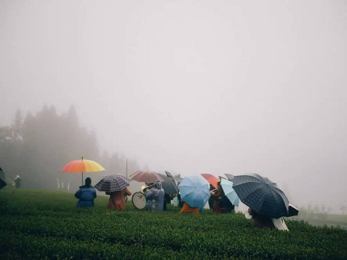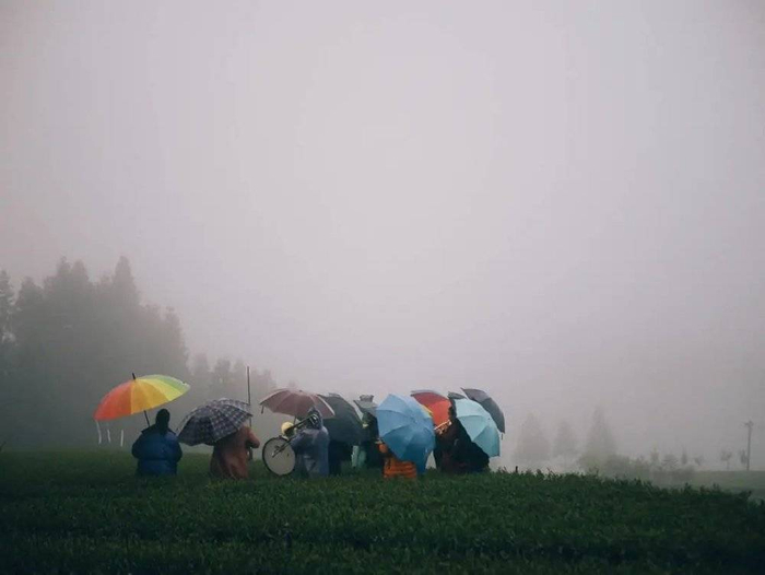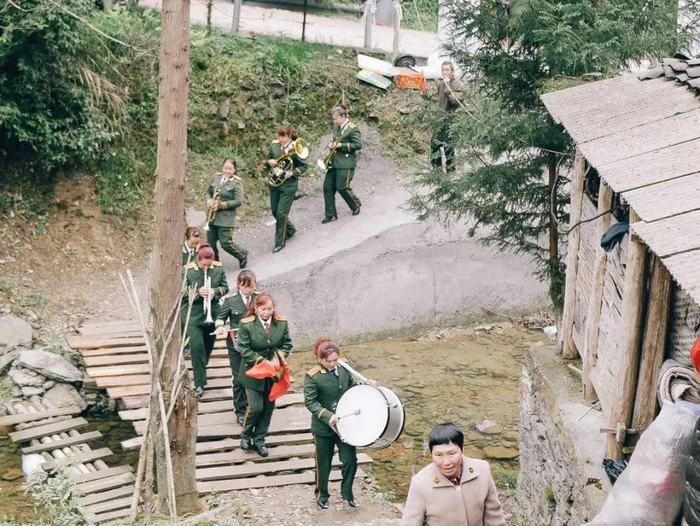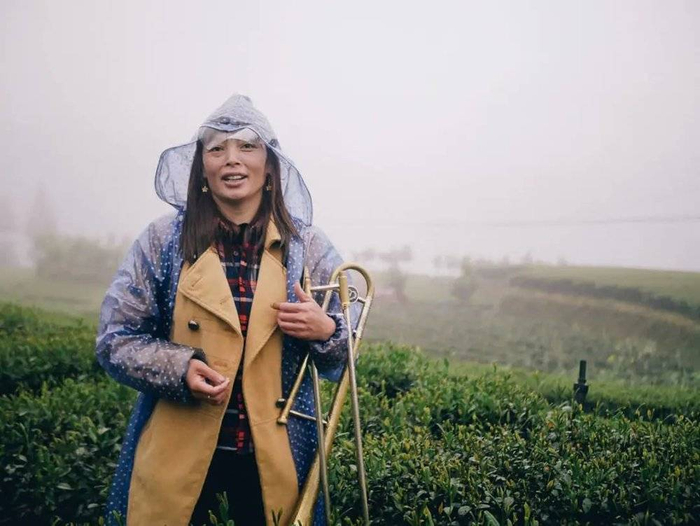 乐手们站在茶园里,举着伞,穿着雨衣,奏起了《南泥湾》。