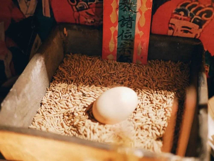 祭祀的物品。一只鸡蛋放在稻谷里。