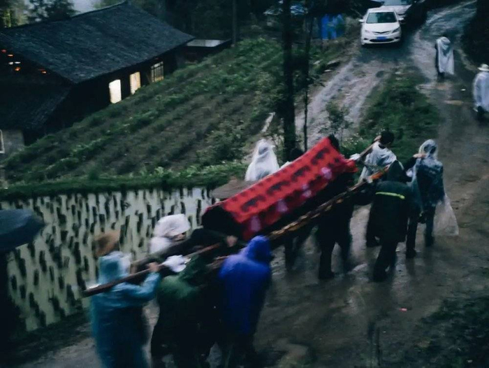 天上下着雨,棺材从堂屋放到院子中间,人们准备出发。