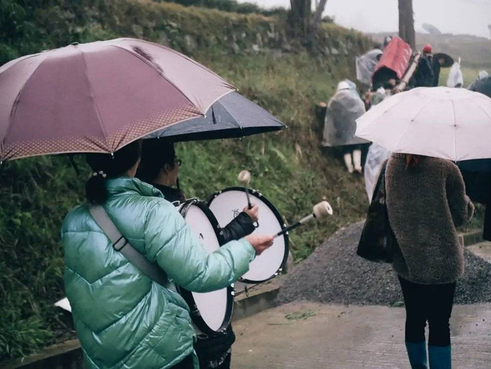 第三场是在邻村,离我家不远,一位老人的葬礼上,有传统的花锣鼓也有山梆鼓还有各种表演。第二天早晨5点多,乐队们去送葬。大概在5点45分左右,出殡,哀乐响起。6点25分左右,到达墓地。墓地前是一块绿色的茶园,天上飘起了小雨,乐手们站在茶园里,举着伞,穿着雨衣,对着远方演奏起了《南泥湾》。