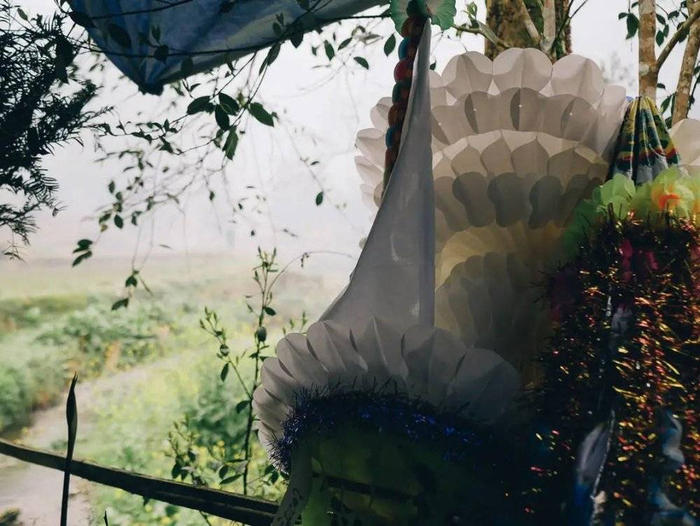 我到这里时快傍晚了,天下着雨,看到这些绚丽的祭祀物品,感到有些沉重。