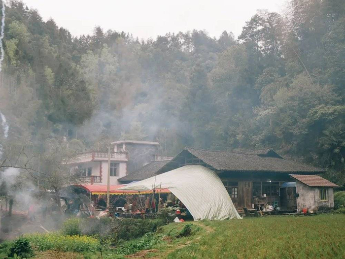 远观葬礼。旁边还有一块稻田,再过不久,人们要在这里犁田,插秧。