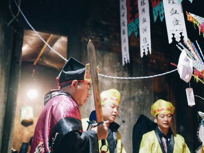 道士们坐在棺木的后左方。他们的表演一般在晚上进行。