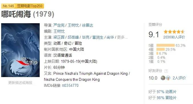 “哪吒”绝对是中国动画吉祥物。央视《哪吒传奇》豆瓣评分9.0,票房灵药《哪吒之魔童降世》8.4分,刚刚春节档《新神榜:哪吒重生》7.3分。