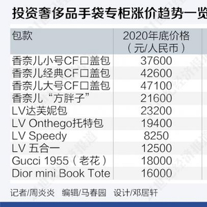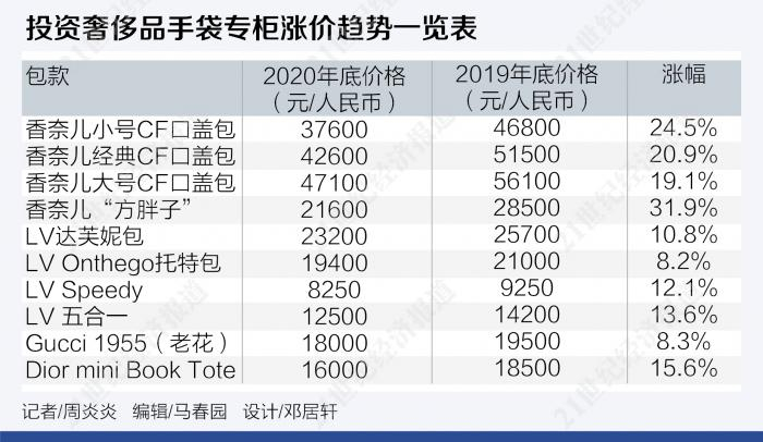 LV、Dior、Gucci也不例外,下图是一些热门包款2019年底和2020年底价格的对照。