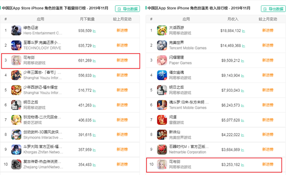 值得一提的是,尽管《花与剑》有不少缺陷:如可攻略男性角色3D建模崩盘,遭到不少玩家吐槽,但一经上线还是受到了热捧,根据七麦数据,当月在App Store的下载量和收入都跻身排行榜前十。