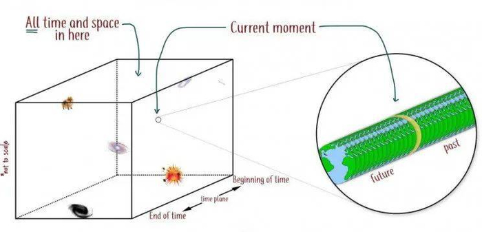 这个宇宙模型,叫做块状宇宙(Block Universe)。这种对时空的观念,就称为永恒主义(Eternalism)。1