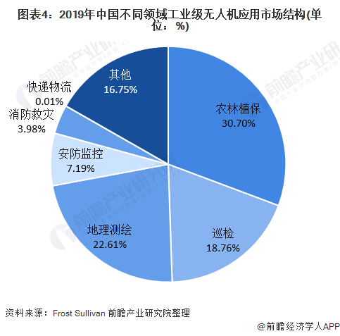 2019年中国工业无人机主要应用领域里,农林植保占比最大,约30.70%,其次为测绘与地理信息、巡检、安防监控及消防救灾,占比分别为22.61%、18.76%、7.19%及3.98%。