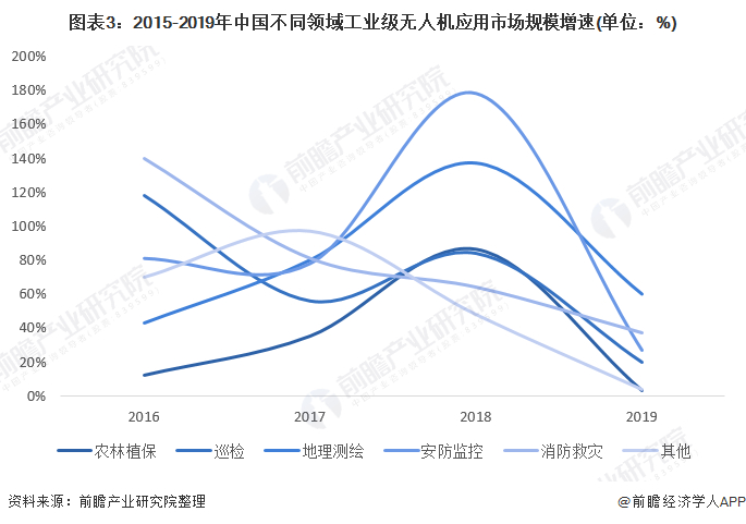 从增速上看,2015-2019年,农林植保、地理测绘、安防监控应用市场规模增速呈先上升后下降的变化趋势,巡检、消防救灾应用规模增速整体下降。其中,2019年,各领域应用规模增速均有所下降。