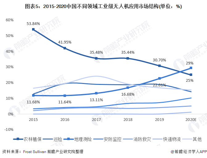 从应用占比变化趋势上看,2015年以来,农林植保占比较高,但占比呈现逐年下降趋势,测绘应用占比则逐年上升。若以此趋势变化,至2020年,测绘领域工业无人机应用规模占比约将超过农林植保领域占比,测绘领域或将成为工业无人机最大应用领域。