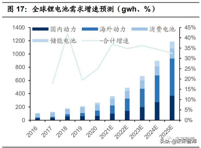 (1)锂电池需求总量测算:2025 年全球锂电池需求量预计达到 1187GWh。全球动力电池需求有望从 2020 年的 146GWh 增至 2025 年的 933GWh,CAGR 达到 45%;2025 年全球消费电池需求将达到 152GWh,CAGR 为 10%,储能 电池需求有望达到 102GWh,CAGR 达到 30%。