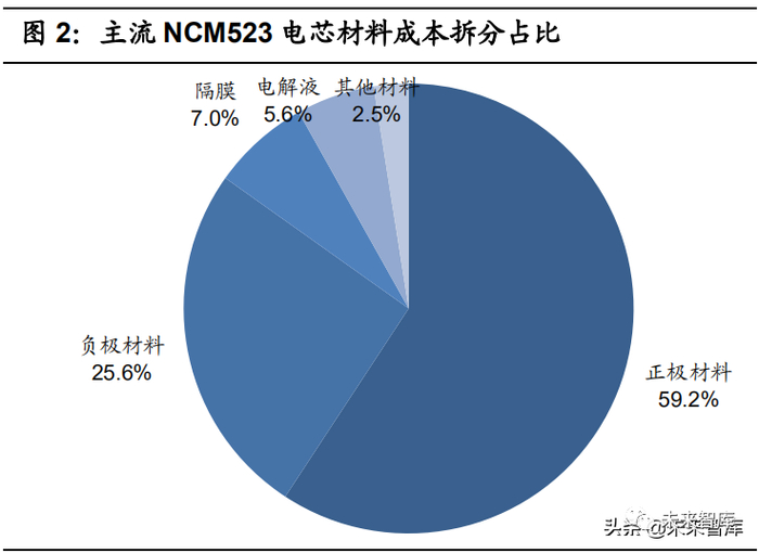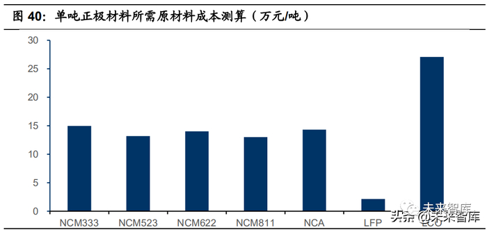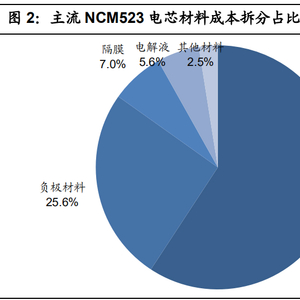 1)价值量占比高:我们在之前的报告中拆分了电芯尺寸为 20*87*285 的 NCM523 以及 20*99*322 的 LFP 电芯成本,在电芯制造 95%的良率下 NCM523 中正极材料成本占比接近 60%,LFP 中正极成本占比也超过 30%,要显著高于 其他的负极材料、隔膜和电解液