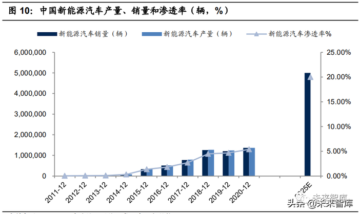 新能源汽车销量预测:2025 年全球近 1600 万辆,国内超 600 万辆。2020 年国内外新能源汽车销量增速显著提升。2020 年国内新能源汽车销量 136.7 万辆,同比增长 10.9%,增速由负转正。全球新能源汽车销量达到 324 万辆,同比增长 43%,其中欧洲市场新能源车登记辆近 140 万辆,同比增长 137%。我们预计全球新能源乘用车销量有望从 2020 年的 324 万辆增至 2025 年的近 1600 万辆,CAGR 将达到 38%,预计全球新能源乘用车渗透率有望达 到 18%左右。国内新能源汽车有望从 2020 年 135 万辆增至 2025 年的 628 万 辆,CAGR 达到 36%,国内新能源汽车渗透率有望达到 23%左右。
